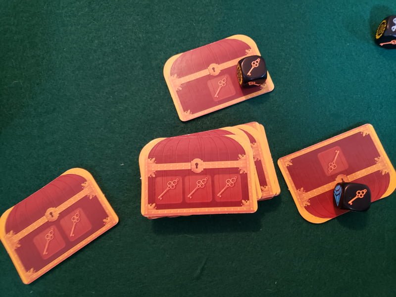 Players can keep the result they get or reroll them all (a reroll is only allowed once per turn). They can then use the dice to unlock a chest or claim the treasure. To unlock a chest they must have the same number of keys as indicated on the Chest Card.
