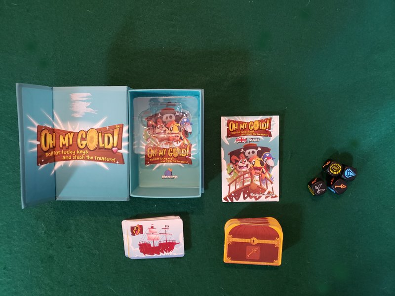 Oh My Gold! is a dice rolling game for 2-4 players ages 6+ that takes about 10 minutes to play. In the game, you act as pirates trying to claim more treasure than any of the players.