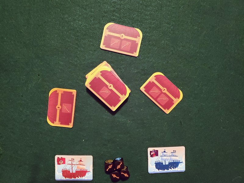 Oh My Gold! is super easy to set up. Each player gets a ship card to start off with, which they place in front of them. Then all the Chest/Treasure Cards are shuffled and placed in a pile. Three cards are removed and placed Key Side up around the main pile. The playing space takes up less room than most restaurant kids’ menu coloring sheets, so as long as your kid isn’t prone to flinging dice hard across a table, you can probably get away with pulling this out to entertain kids at a variety of places.
