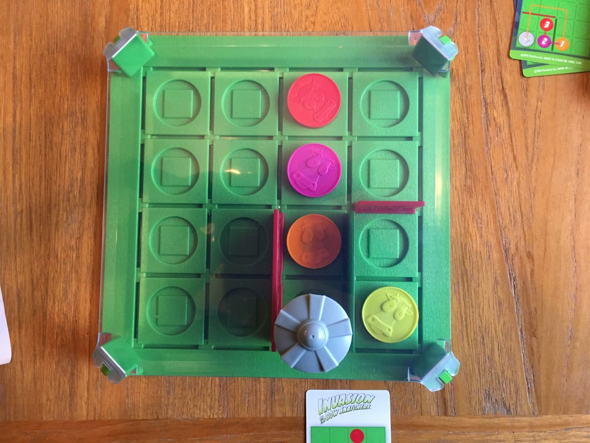 I have a couple of complaints about the game, but neither of them is a deal-breaker. First, it’s awkward to put everything back in the box. The plastic inserts that come with it are hard to position, but pieces fly around in the box without them. Including a bag for the pieces would have been nice; the bags they came in weren’t resealable. Second, the height of your UFO above the magnetic pieces while you play matters quite a bit. Too high and you can’t pick up the cow. Too low and you pick up adjacent cows. So any warp or bend of the plastic lid can affect this. Be sure to move slowly and carefully.