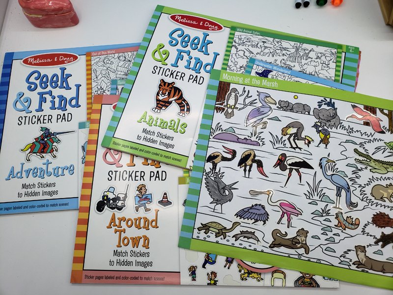 Our favorites most recently have been the Seek & Find Books (three-pack for $14.99 via Amazon) that combines stickers and coloring. Pictures are a little smaller in these so they might be geared better for the elementary school crowd.