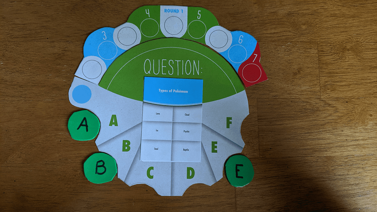 When choosing their answer tokens, players need to find one of the correct answers and select that matching token, So if you were pretty certain that Ice was a type of Pokemon, you would select your B token as that answer matches up to the B segment on the board.