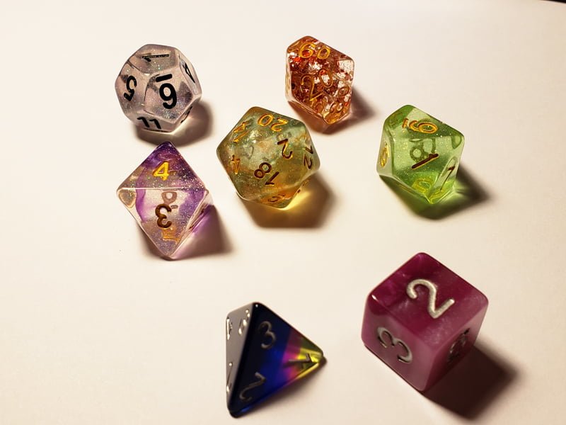 - d10 (1-10) “Green Iridescent,” a translucent green with iridescent glitter.