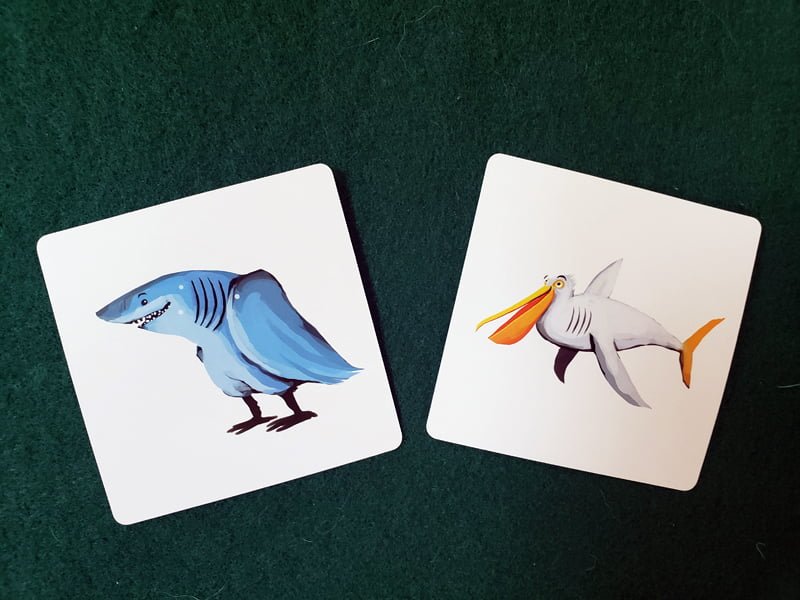 The goal of Pigasus is to match the most animal hybrids, but the cards are not perfect matches. For example, the Shark/Pelican combo has one card with a shark head and a pelican body, but its match has a pelican head and shark body.