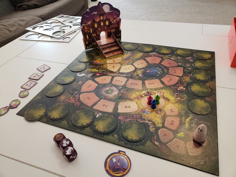 I love how the little Wizard Students, Willy the Warden Ghost, and the dice are all made of wood. The game board is solid cardboard, as are the rest of the game pieces. My only quibble is with the staircase. It is meant to be assembled one time, but the lower step pieces seem prone to sliding out, since the slots are pretty narrow and the stair doesn’t have much of an edge to go in. If you’re not careful, you or one of your kids can start separating the cardboard at the edges if you try to jam it back together too hard. You might find that a little glue helps to keep this secure. Otherwise, the pieces are all great.