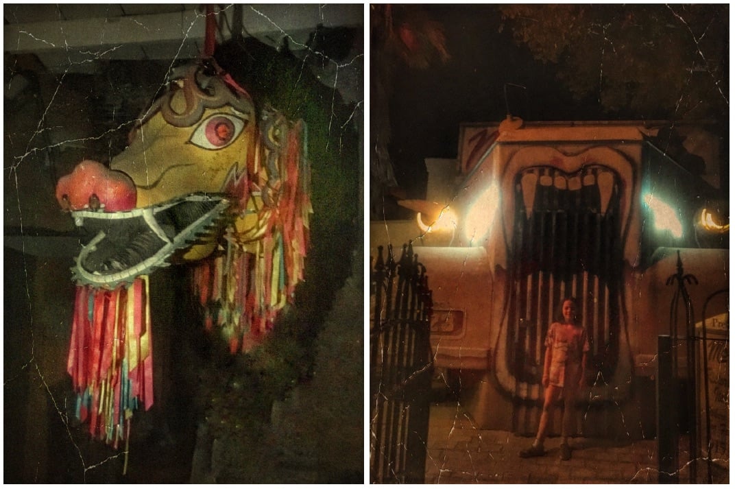 If you turn the corner the other way, there is another dark section of the restaurant and saloon. No one was in there, but something about it felt, well, unsettling. A large dragon head, which turned out to be an actual prop from an early James Bond movie, stares you down, and hidden in the darkness is a large skeletal display that was near impossible to get a good picture of with my husband’s smartphone.