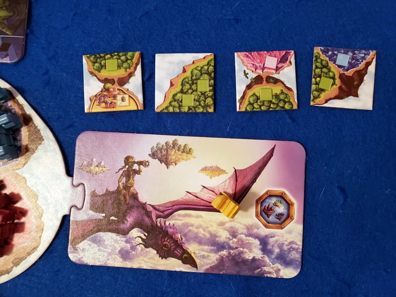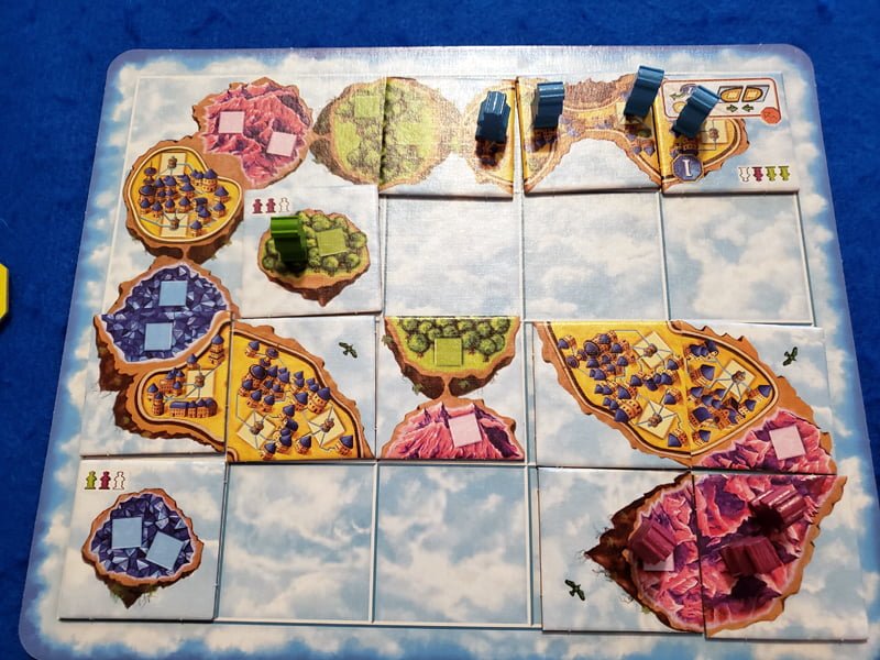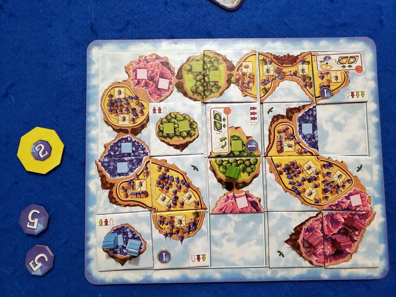 If your a fan of tile-laying games that you can play with kids as young as eight, Skylands is a game you should check out. The recommended age of eight is probably pretty fair within certain limits. The game mechanic is easy enough for an eight-year-old, especially if they’ve played other tile-laying games, but I don’t know that our eight-year-old could play the game by himself with other eight-year-olds who have never played it before. So if you treat it as a game for grown-ups your kid can join in on, you’ll probably be fine. I probably would not bring in players too much younger than eight unless they have a lot of experience with tile-placing games.