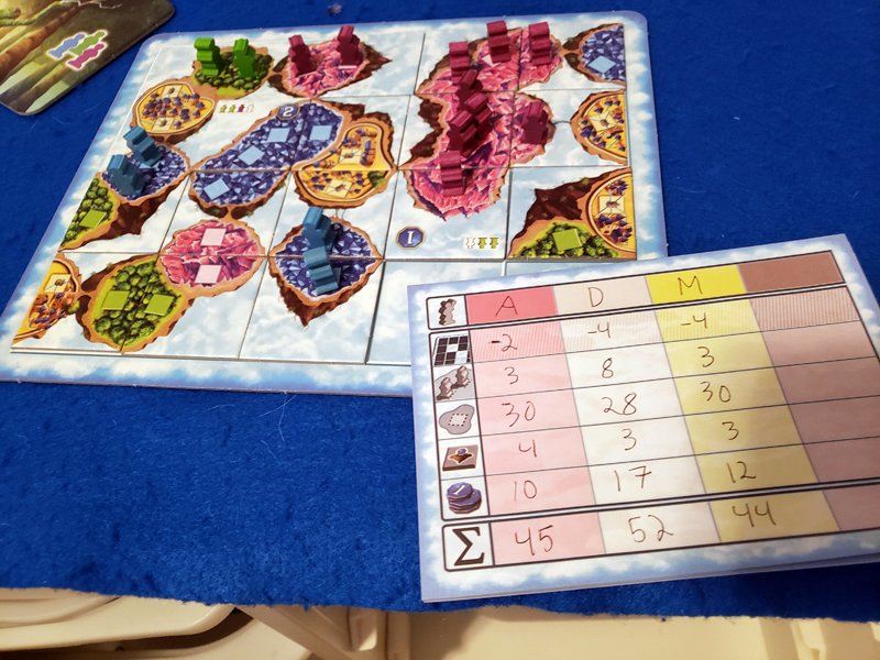 Starting with the Active Player, each player chooses one complete island to fill with Inhabitants of a matching color. This can only be done with wood (green), crystal (blue), or pink (mountain) islands. If there are not enough Inhabitants left on the Supply Board, the player can only take what is available.