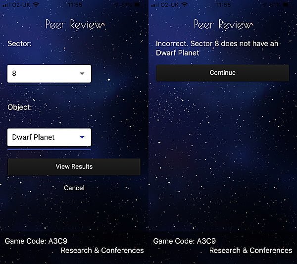 - Peer Review: If a theory token reaches the final square, it is Peer-Reviewed. The Theory Token(s) in the inner space are flipped over to reveal what the player who placed it there believes is hidden in that sector. One player then selects Peer Review from the app and enters the information to check if the theory is correct, revealing the information given to them by the app to all the other players. Any other Theory Tokens in that sector are now flipped over.