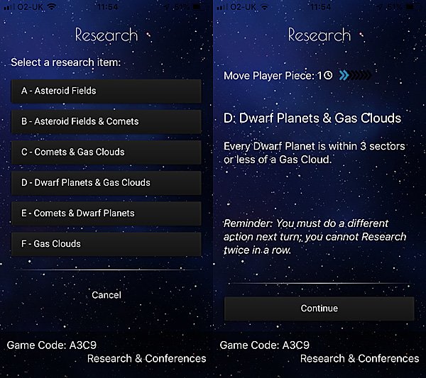 Once per game (twice in expert mode) players will attend a Planet X conference. One player will select “Planet X Conference” from the app and read aloud the information revealed to all other players. This phase is similar to a Research action but has no time cost.