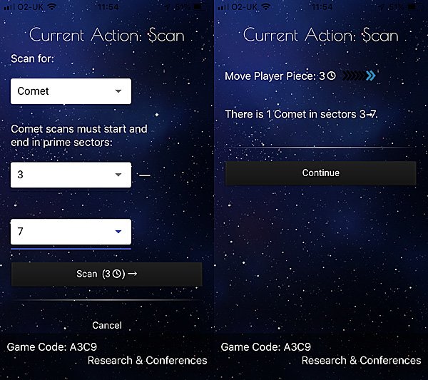 Using the app, the player scans a range of sectors to look for a specific type of object (Asteroid Fields, Comets, Dwarf Planets, Gas Clouds, or Empty Sectors). The Active Player decides which object type they want to scan for and how many sectors they want to scan (between one and six, all of which must be part of the Visible Sky). They then announce this information to the other players and input their scan details into the app. The information they learn from their scan is private and not announced to the other players but is recorded on their note sheet.