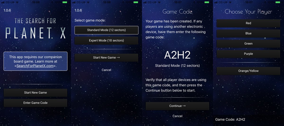 One player then uses their electronic device to generate a game code. On the app, they should press “Start New Game,” select “Standard Mode” then, “Start New Game”. This will generate a game code. Players using other electronic devices can then open their own copies of the app, press “Enter Game Code,” type in the code generated by the initial player, and press “Join Game.” Once all players have verified that they are using the same game code, they all press “Continue.”