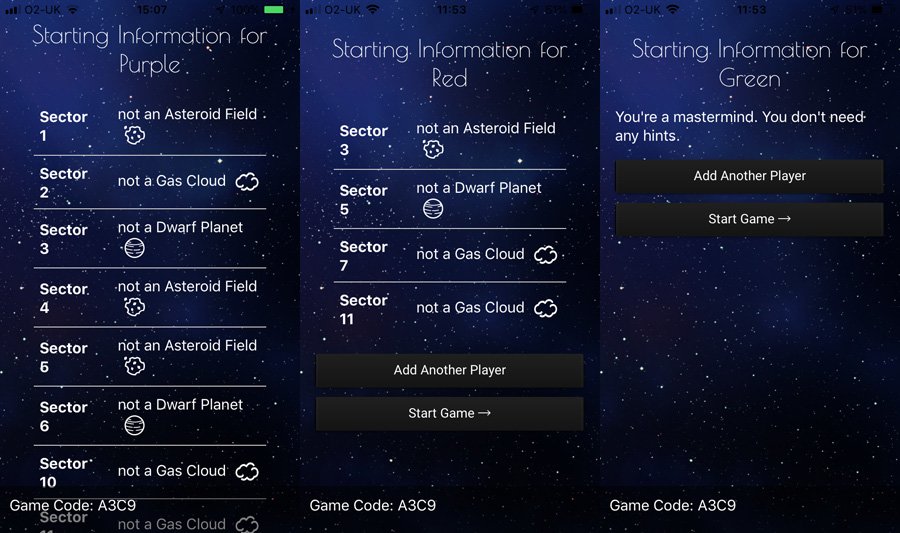 When you have been searching for a while, you might decide that you know where Planet X is located. You may then choose to search for it. Choosing to Locate Planet X is similar to targeting, however, you must also correctly input the objects in the sectors either side of your chosen sector. For example, if you believe that Planet X is located in Sector Four, you must correctly identify the objects in sectors three and five. As usual, a player choosing this action must announce that they will be attempting to Locate Planet X to the other players then input all the information into the app.