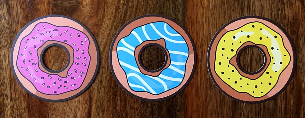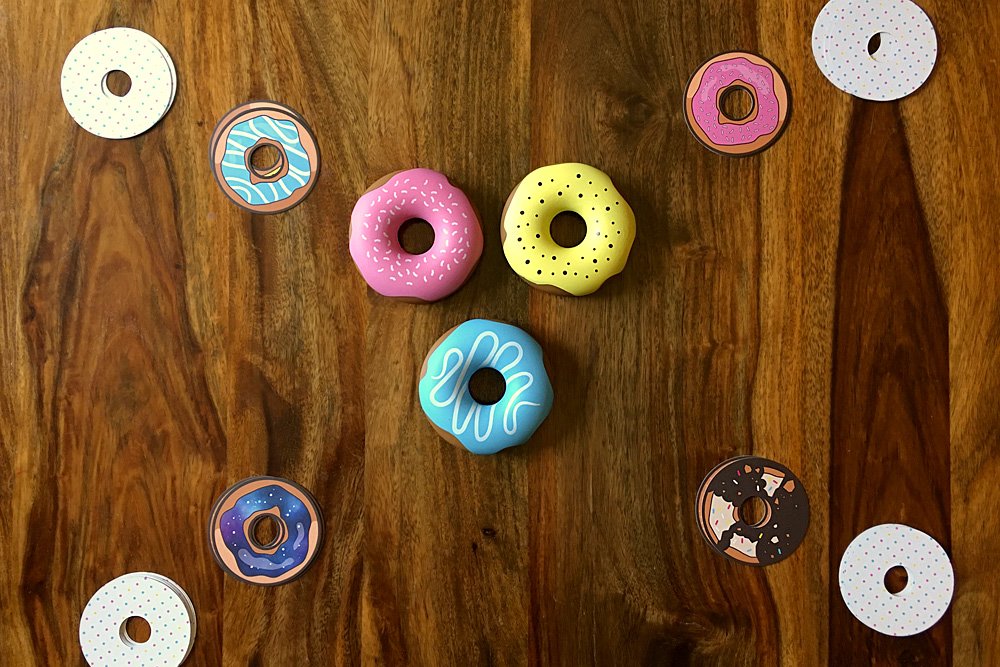 The three donuts are placed in the middle of the play area so that all players can easily grab them. If this is a three-player game, only two donuts should be used and the cards corresponding to the donut that has been removed should also be removed from the deck. Otherwise, all the cards are shuffled and ten are dealt face-down to each player. Players should not look at their cards but leave them face-down in front of them.