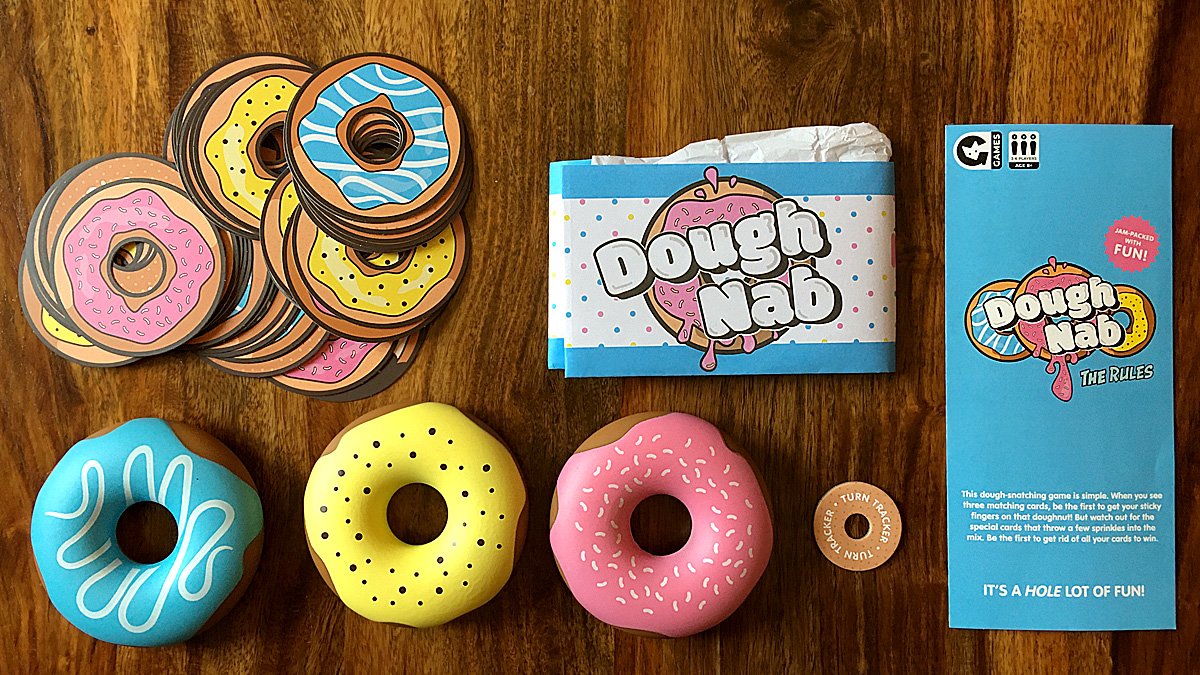 Dough Nab is a quick-paced, donut themed game that will have everyone laughing as they race to be the first to snatch colorful donuts from the table and get rid of all the cards in their hand.