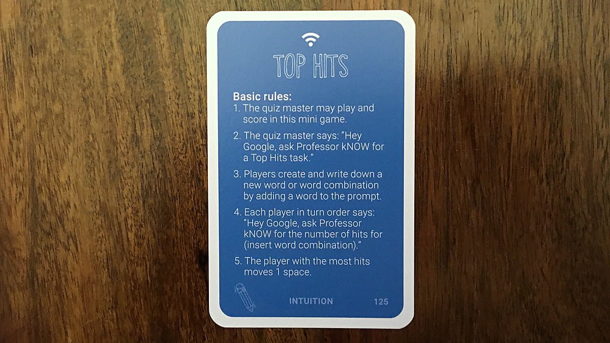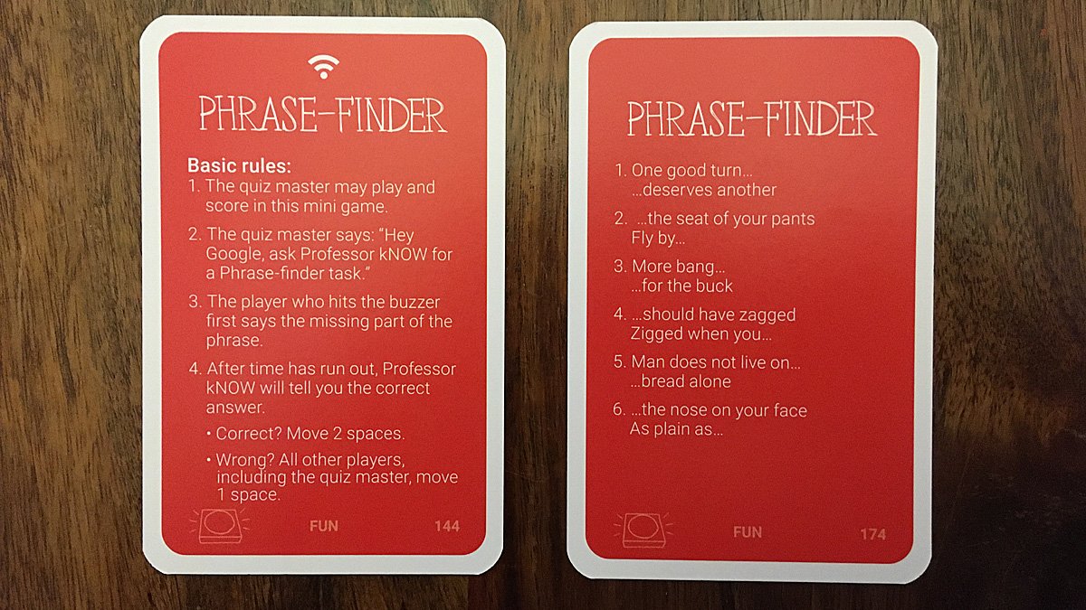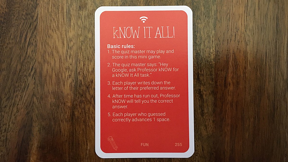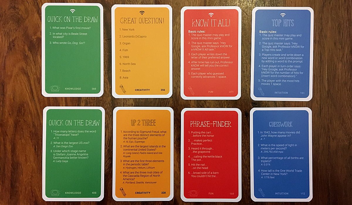 Many of the card types will ask you to consult Professor kNow for questions and answers. Professor kNow is part of the Google AI, and the correct verbal instructions to access these features are included in the instruction sheets that come with the game.