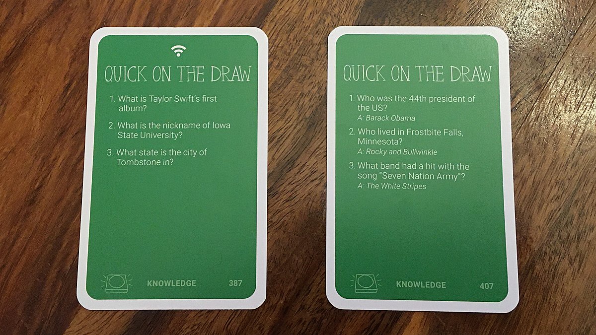At the start of a turn, the Quiz Master takes the top card from the appropriate colored stack and reads it out loud. If it is a type of mini-game that has not been played before, the Quiz Master can read the rules from the instruction booklet or ask Google to read them aloud instead. The types of mini-games are divided into four categories: