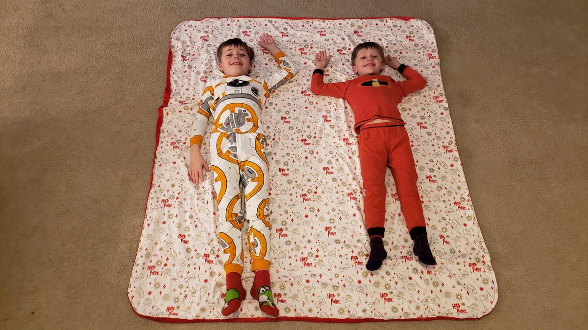 In the past nine months or so, I’ve gotten back into sewing as a hobby. It sort of took a back seat when my kids were younger, but now that they’re older (nine and six), I’m less concerned with them doing dangerous things with sharper sewing tools, and I feel like I can set things out and sew again. I’ve mostly been working on making fun plush creatures, but one of my favorite pattern sources, Choly Knight, offers some non-plush projects like this free double-sided cuddle blanket pattern. I’m not sure when the idea first came up to make these with my boys, but sometimes they do show interest in my sewing machine when I’m working on making a little plush critter. A blanket is a much easier project to take on than a plushie, and we all love snuggly blankets in this house so Black Friday weekend found me in the Jo Ann fabric aisle with my boys picking out the fabric to make some blankets of our own.