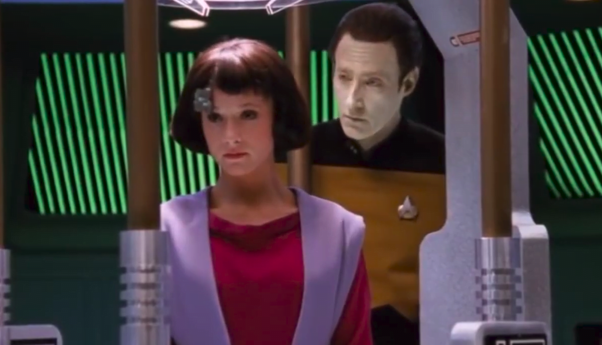 This episode features Juliana Tainer, who claims to be the former wife of Noonien Soong, who created Data. She and Data talk about Lal. She was the one who wanted Data to be able to be a painter. She turns out to be an android based on Soong’s real wife who died and doesn’t really know she’s not human. Soong made her even more human-like in physical terms than his previous builds. Sounds familiar! She also tells Data that there were three Soong androids before him, including B-4, who we meet in Nemesis and hear about in Picard.