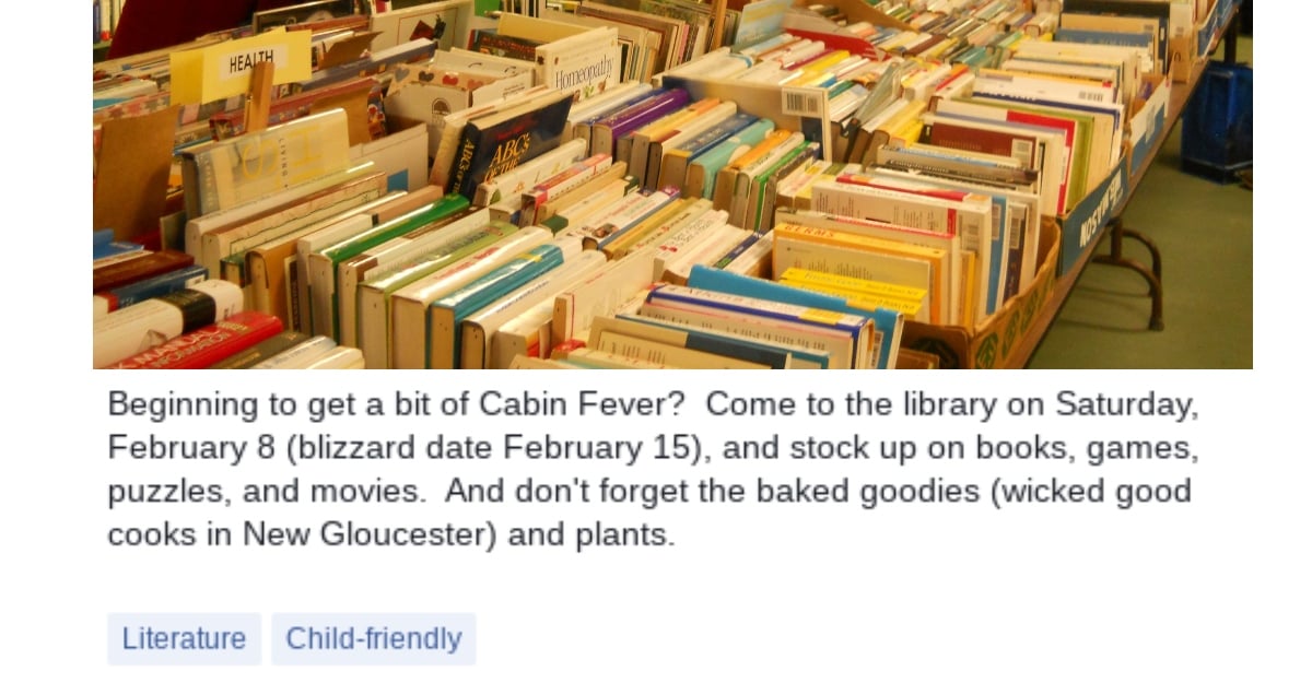 My father and I plan visits to book sales like some people plan out vacations. Shortly after Christmas we start stalking the websites of past library sales. We of course check to see if Book Sale Finder has any updates. We look to our usual haunts for this year’s schedule. Our first book sale of the year is typically the Five Colleges Book sale, in Lebanon NH, mid April. It’s a jaunt from Eastern Maine to the New Hampshire/Vermont border, but it is a used book nirvana, and one of the highlights of our year. This year however, we were pleasantly surprised by a Facebook post, from a relatively local library.