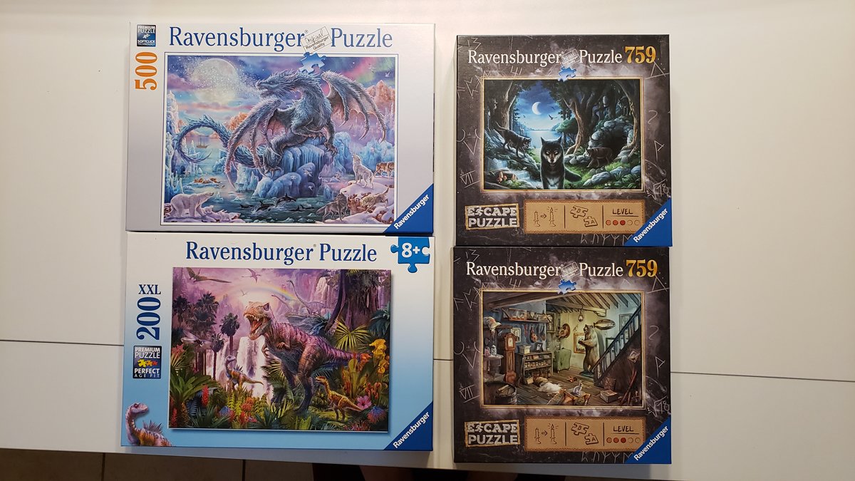 Even out here in the Southwestern US, we’ve had some spurts of nasty cold and rainy weather which has lead to a lot more “indoor activity” days for the kids. Like a lot of families, we try to keep some limits on how much screen time we let our kids have which can lead to a scramble for new stuff for the kids to do while stuck inside. Luckily, I got offered a chance to review some of the new 2020 puzzle releases from Ravensburger. I’m a big fan of puzzles. They’re clearly an activity that promotes brain power, and I’ve always found something relaxing about putting them together. Puzzles are engaging without being high stress, and there’s always a logical solution. Ravensburger sent me four of their new newest releases: Dinosaur Land (200 pieces), Mystical Dragons (500 pieces), and two of their “Escape Puzzle” titles, Forbidden Basement and The Curse of the Wolves (759 pieces each).