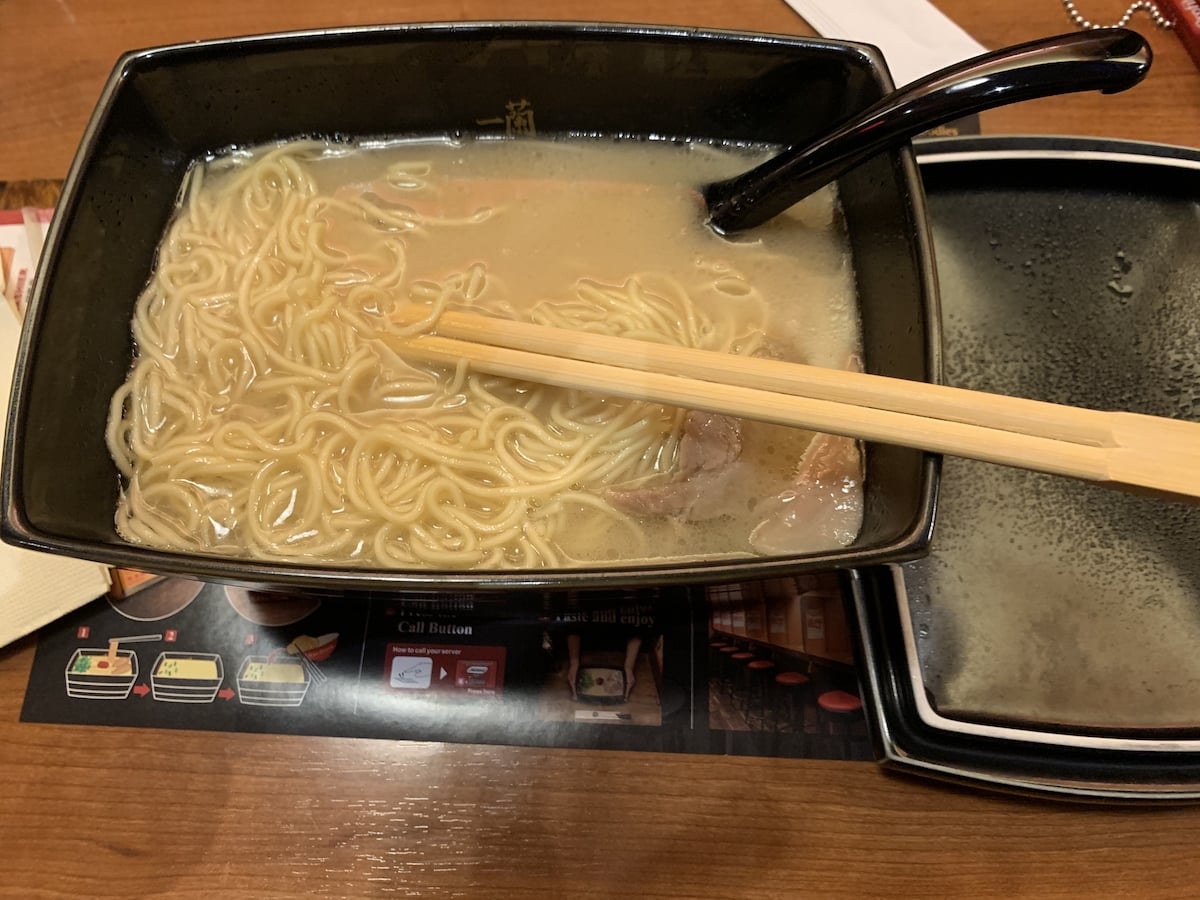 When you walk into the restaurant, a helpful greeter hands you two menus and walks you to a booth with wooden screens on both sides. (Those screens can be folded back for those dining with others.) Fill out the menu by custom-ordering the ramen, press a button when finished, and someone comes to retrieve the menus from the other side. In a few minutes, the food arrives. I loved my pork ramen. I went basic with it, just pork, ramen, and broth, but you can add spicy sauce and other mix-ins. My son added the spicy sauce. He liked it but, be warned, it’s spicy.