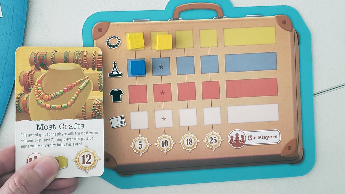 Souvenir Cube: If a Player gets a Souvenir Cube they place it on their Suitcase Mat starting on the left side. For any color, the first Player to fill the slot with the star may claim the matching Most Souvenir Tile. They keep this tile unless another Player steals it by gaining more Souvenir Cubes of that color than they have.