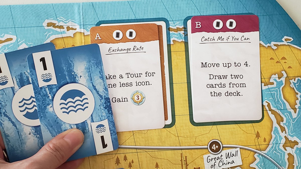 - Decide which Journey Cards to use. For the first game, it is recommended to use A: Exchange Rate and B: Catch Me if You Can. These cards have designated spots on the upper right of the Game Board.