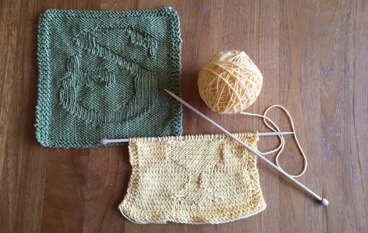 The Seven Horcruxes Washcloths (one lightning bolt in difficulty) are a fun project. As you knit each row, you get to slowly see the image emerge, like the world’s slowest dot matrix printer. It is hard to knit these while doing anything else, though, because each row has different knitting/purling numbers to count. In the above photo, I knit the green one, and my teenage daughter is working on the yellow one. There are seven patterns, of course, so you can have a whole horcrux washcloth set (or gift one to your favorite Potterphile), and it’d be fun to knit them with a craft group, each person doing a different horcrux.