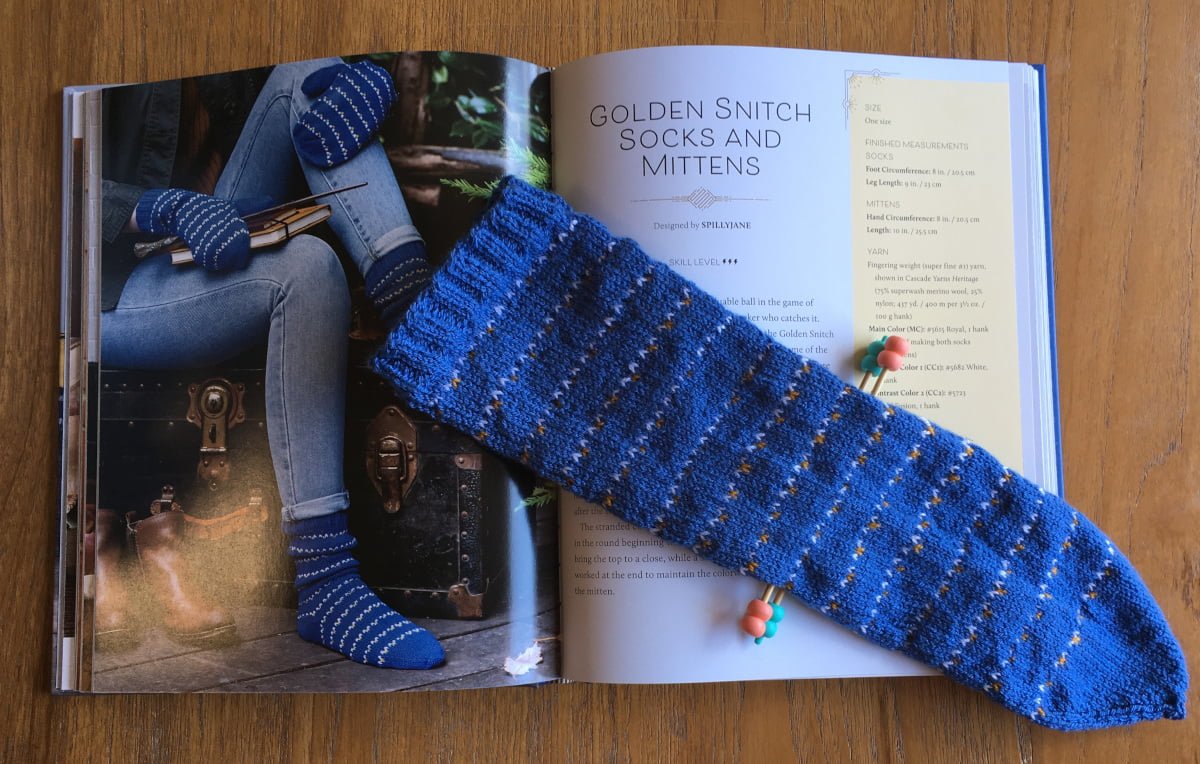 Though it’s been out for over a month, I’m a very slow knitter and it’s taken me this long to try out a couple of the patterns (even though I received the book late last year!). I started easy with The Seven Horcrux Washcloths, since they’re just basic knitting, purling, and counting. Then I moved on to a project that looked manageable, the Golden Snitch Socks.