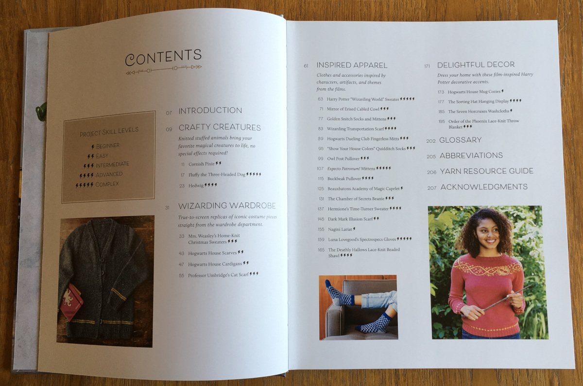 Here are some of my favorite patterns in the book: a stuffed Hedwig, Mrs. Weasley’s Home-Knit Christmas Sweaters, Hogwarts House Scarves, Mirror of Erised Cabled Cowl, Buckbeak Pullover, Beauxbatons Academy of Magic Capelet, The Deathly Hallows Lace-Knit Beaded Shawl, The Sorting Hat Hanging Display, and Order of the Phoenix Lace-Knit Throw Blanket (which requires some very long circular needles). That should demonstrate the variety of pattern selections.