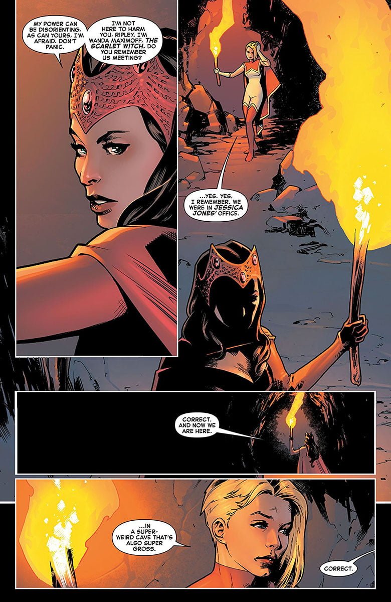 In Star #2 the new wielder of the Reality Stone struggles to master nascent powers prompting an unexpected and unexplained visit from one of the world’s most dangerous and powerful women. Whether the Scarlet Witch has arrived to help her or destroy her is anyone’s guess. Either way, Marvel’s Star series offers us a close up look at the frightened woman who turned from would-be hero to power-hungry villain in the pages of Captain Marvel.