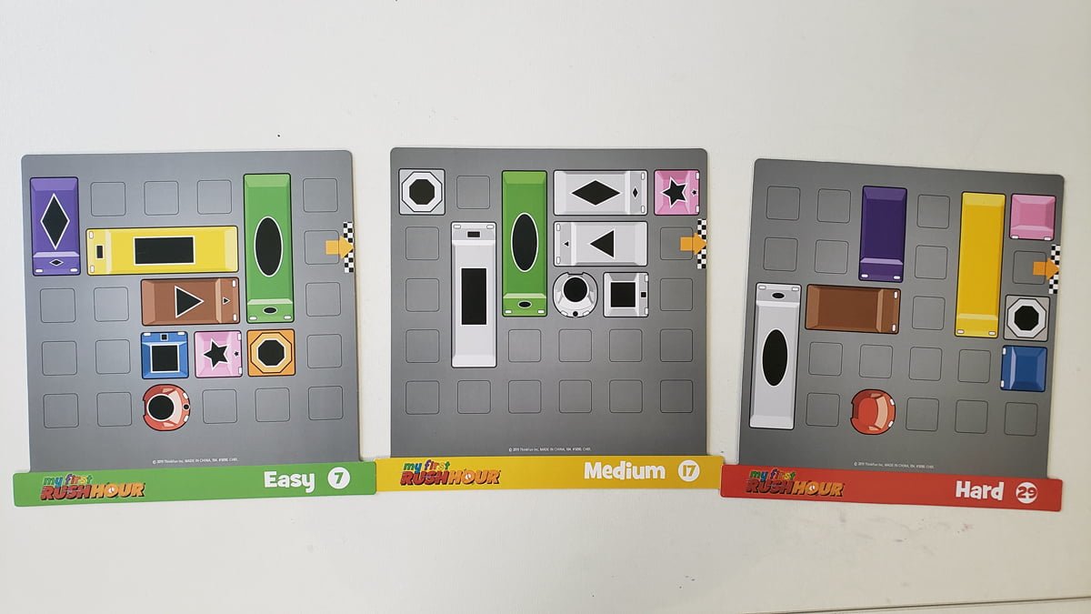 The goal of My First Rush Hour is to help the Red Hero Card escape the Parking Lot Game Grid through a series of 30 Challenges with increasing difficulty. To set things up, players will have to match shapes and colors.