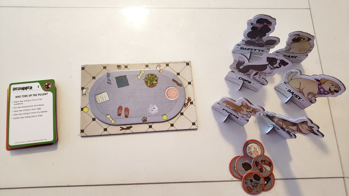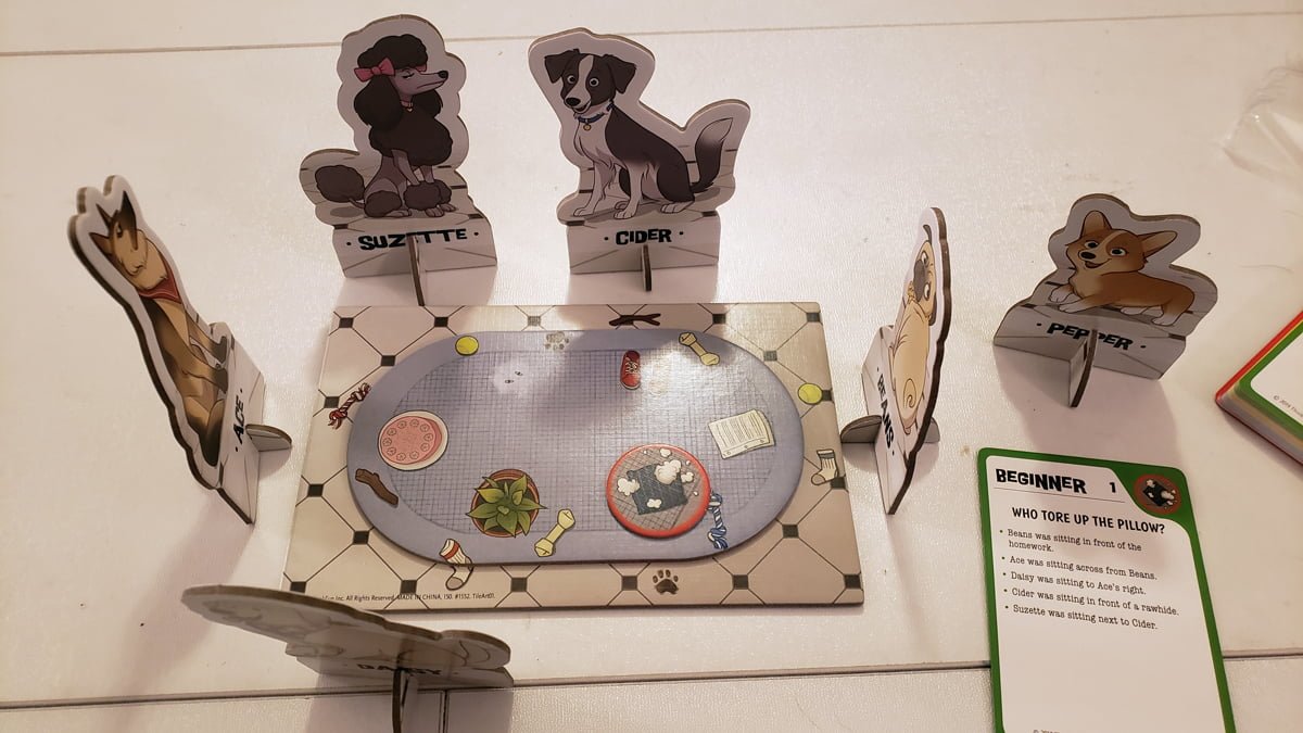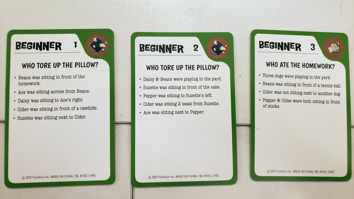 Overall, the pieces are really decent and solid, especially for a game that’s fifteen bucks. The Game Board is two layers of seriously thick cardboard with very fun illustrations of a tile and carpeted area and a series of objects like rawhide bones or socks that can be referenced as clues in the challenges. The Dog Tokens are about the size of my hand and are also made of pretty sturdy cardboard (as are the stands) that should withstand the stands being pulled on and off between play sessions. The dogs depicted clearly represent particular breeds and have other little clues worked in (like bandanas, bows, tail colors, etc). The Crime Tokens are the same thick cardboard with equally fun art of things the dogs might have destroyed. Overall, I think the cardboard durability should withstand many sessions of play with kids. The Challenge Cards come in their own little box and are about the thickness of playing cards. They have the same great artwork on them, and the solution diagrams on the back look exactly like the game layout making it easy to comprehend.