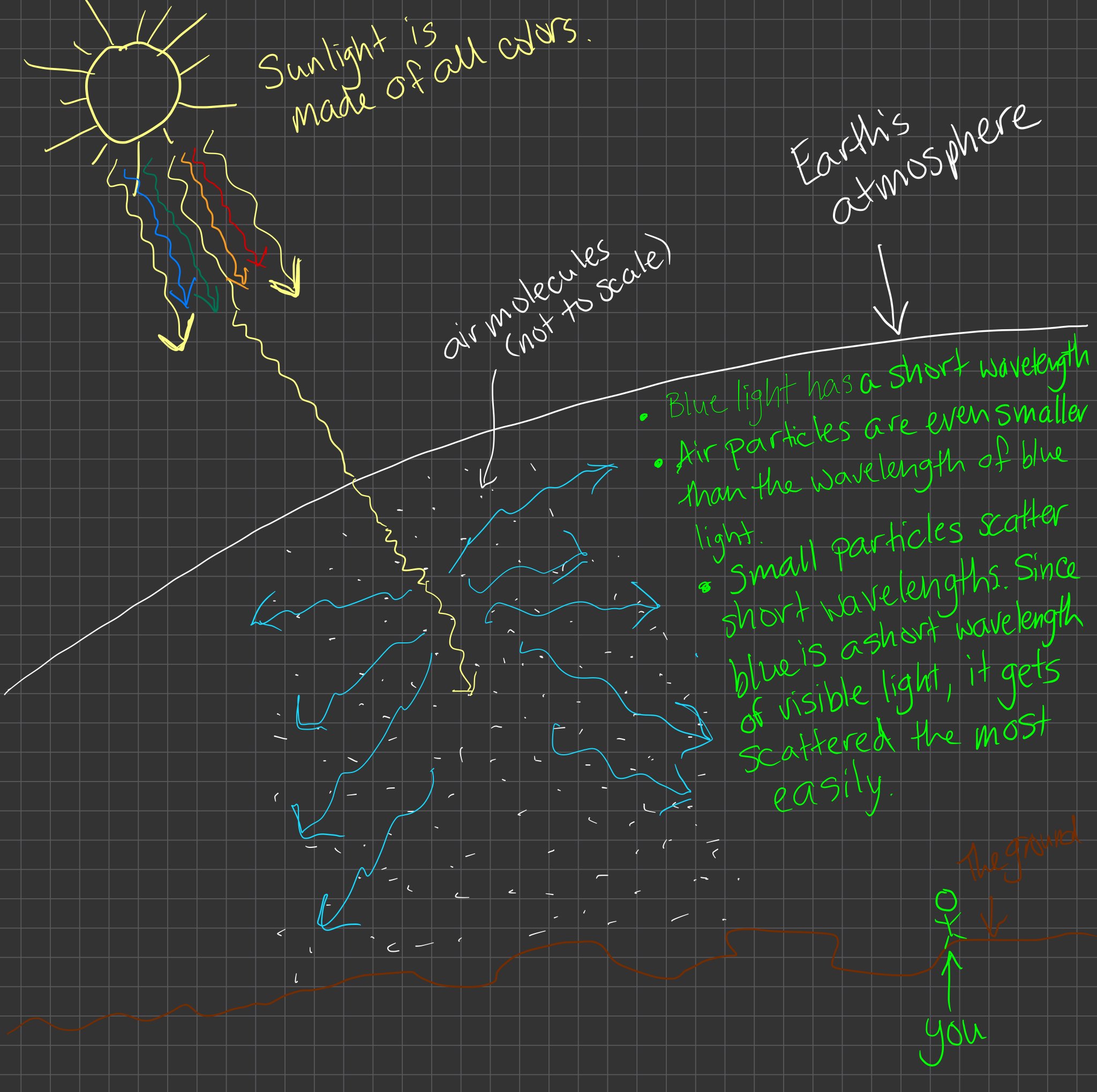 So the light comes from the Sun, enters Earth’s atmosphere, and starts interacting with the air molecules that are in the atmosphere. It just so happens that most air particles are of a certain size where when the light of the Sun hits them, the blue wavelengths of light are of the right size to bounce off them. Other wavelengths are too long, others are too short.