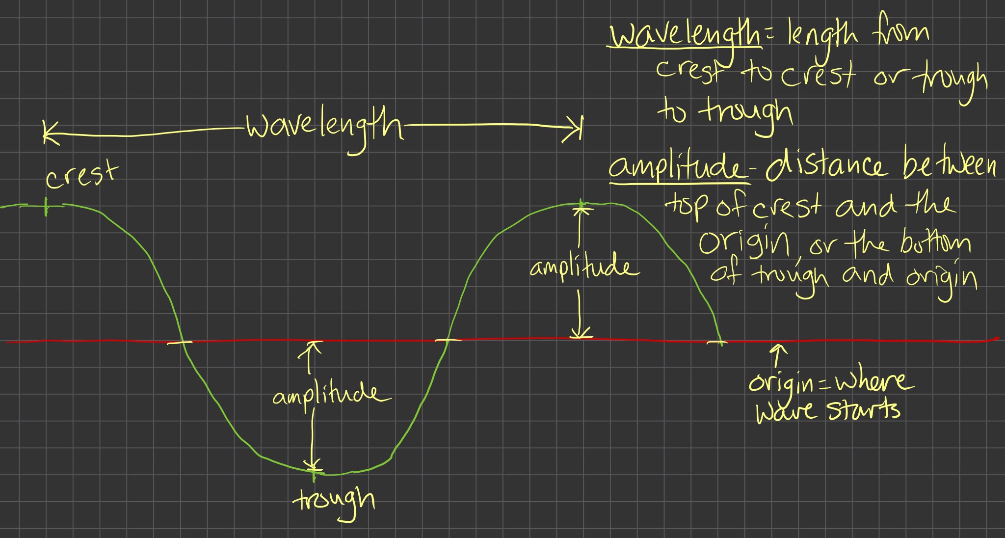 See, light is a pretty interesting and amazing thing, and we still don’t know everything there is to know about it. We consider light to behave like both particles (photons) and waves. There have been all kinds of experimentation into this, and if you are curious to learn more, you can look up “wave-particle theory of light.” There are a lot of great resources out there about this. But looking at the wave aspect of light, we know that light travels in waves. Waves have a structure, with parts, like this: