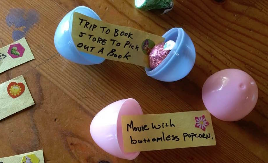 If you have some plastic eggs left over from past years, write some little notes for simple, fun activities to do in the future. These don’t have to be elaborate trips or big gifts, but small, fun, favorite activities your kids will look forward to: