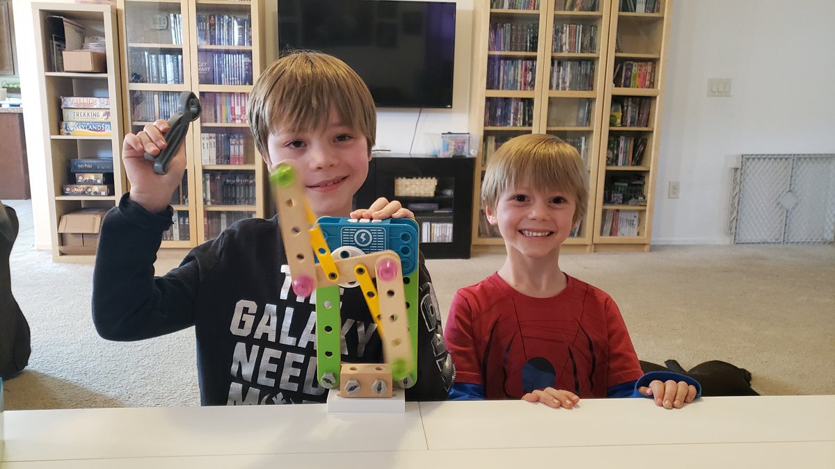Next up was the Record and Play Set. This one has 68 pieces with the focus being a unit that can record and play small sound snippets. Like the other set, it includes sturdy wooden and plastic pieces with enough variety to really let a kid’s creativity get going. This one also had a booklet with some ideas, and the boys selected the cat-like creature. Now that they had gotten the hang of things from their first build, building this second project went a touch easier. A still took the lead on things, but W (age 6) was able to help build with some guidance. Once they got the cat together, they were able to press the little record button, make a silly noise, and then play with it (no batteries needed for this one). They honestly spent about the next hour playing with the cat alone once it was built.