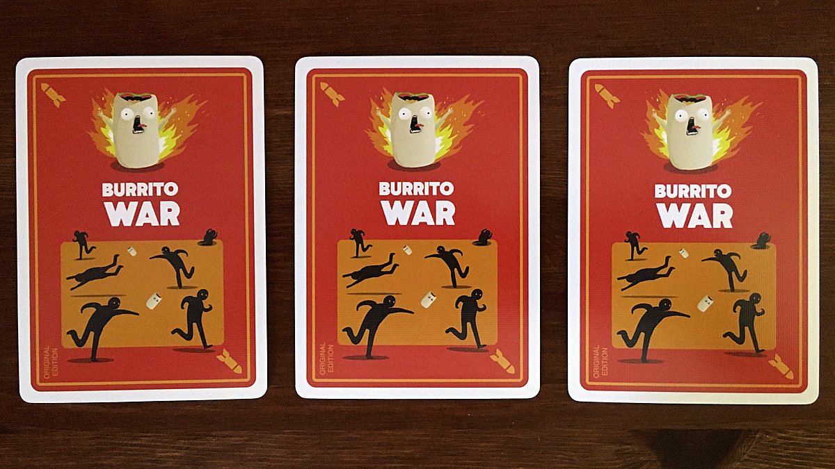 When a player collects three War Cards, all players are immediately in a War, except for the player who triggered it. Everyone tries to grab a foam burrito and throw it at any other player (except the triggering player). The first to get hit loses the Brawl and is awarded a Burrito Bruise.