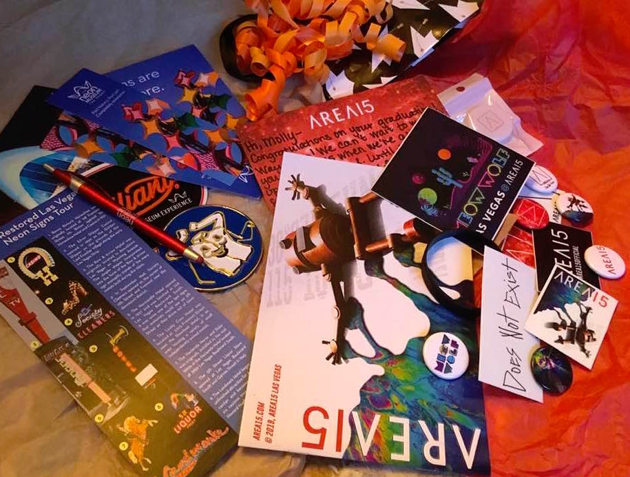 In our daughter’s case, we wanted her to know we will still take the trip she had been looking forward to in the future. To do this, I sent notes to some of the museums and attractions she wanted to visit, asking them to send a brochure or guide and, if they have it, a free promotional item like a pen or sticker. Three of the places she wanted to see were Las Vegas, The Mob Museum, Meow Wolf at Area 15 (which had been planning on opening this summer), and the Neon Museum, which sent some great promotional items such as buttons, pens, bookmarks, and promotional bracelets. The Area 15 crew even wrote my daughter a personal note congratulating her, which to me was just above and beyond cool.