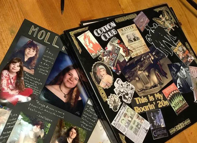 Use a book with a plain cover so you can personalize it with a style that is special to them. My daughter was so excited to be part of her own “Roarin’ ’20s,” and this first year has already been a crazy ride. I made her a cover that mixed her current interests with some favorite images of the 1920s.