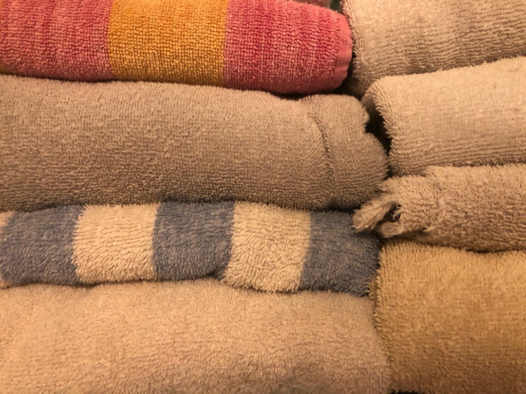 Towels can be utilitarian, but they can also be luxurious. My brother has a terry cloth robe from the Waldorf Astoria and it is the softest thing I have ever touched. I personally covet the blue and white striped pool towels of the hotel I stayed in while at the Hynes Convention Center in Boston. I have a towel that was gifted to me at my wedding in 2003, I have towels that were purchased from Home Goods as recently as 2019, but don’t we all have at least one towel from Home Goods? If my towels are all dirty, I am affected on a deep level. If they are all clean, the row of neatly piled plush towels fills me with a joy that is hard to explain.