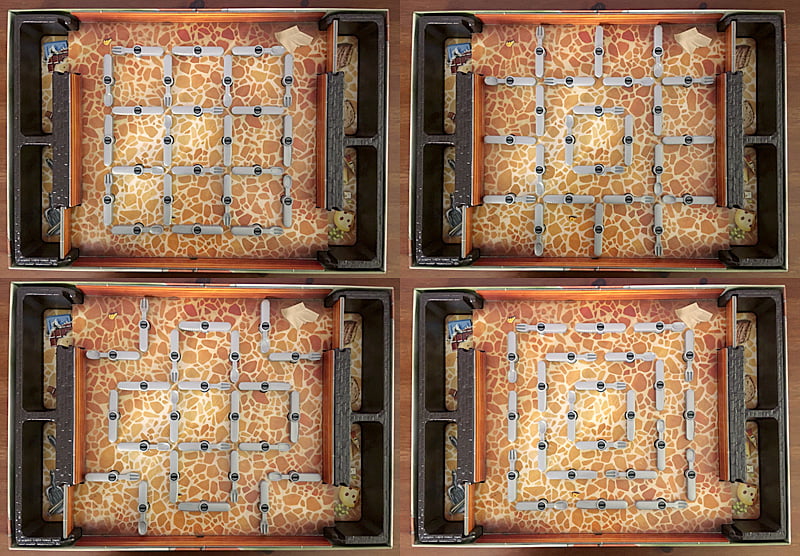 Place the Bug Tokens into a pile near the board. Each player chooses a corner of the board with a trap. Any unused traps are closed off using the trap door pieces. The players decide which of the four starting positions to use for the Utensils and turn them to form this design.