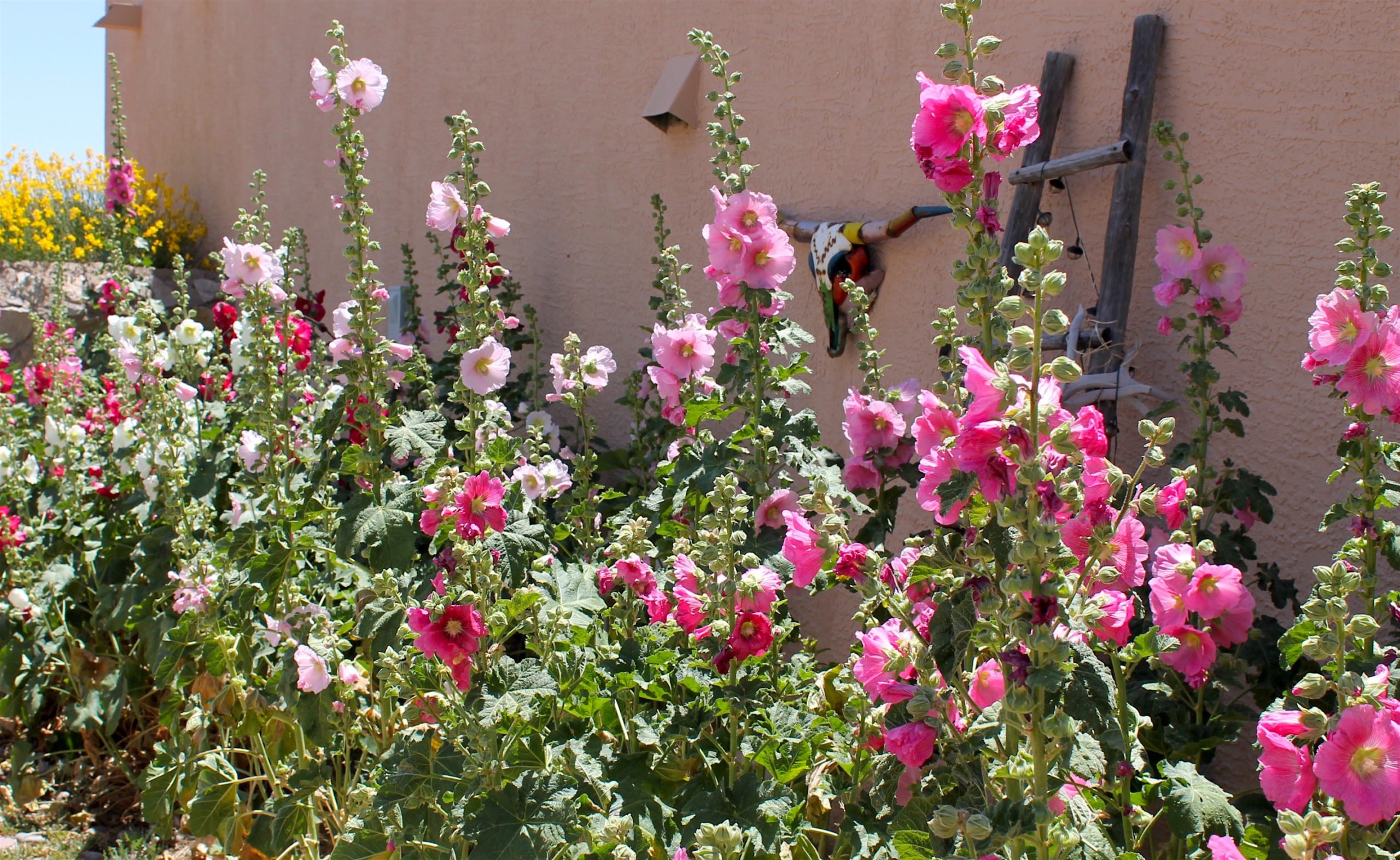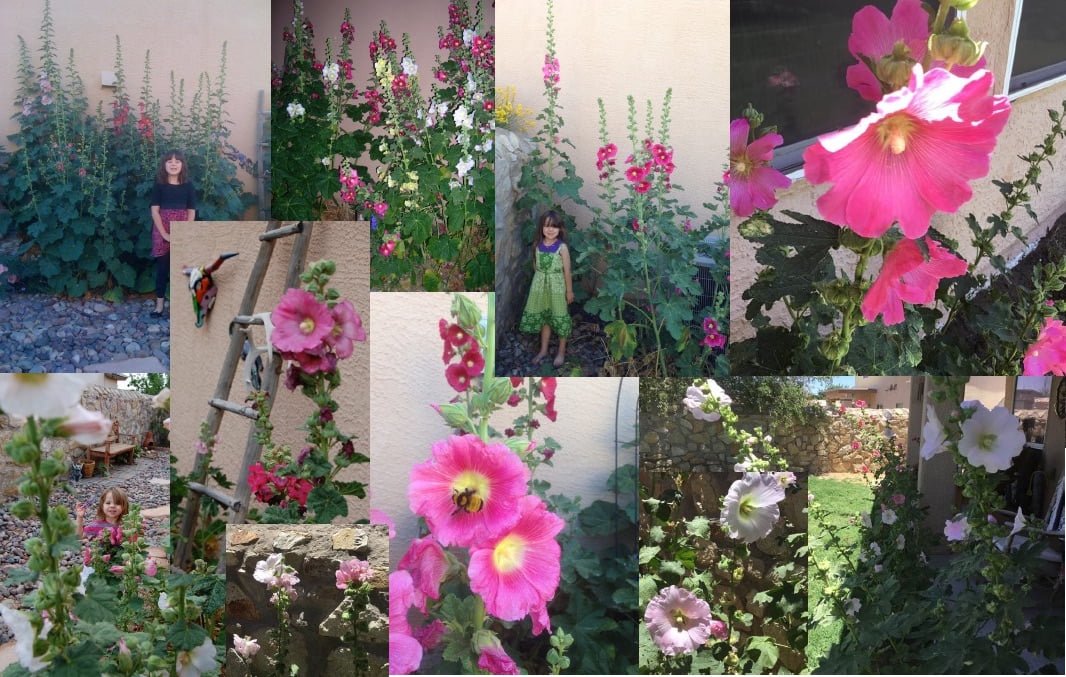That evening in mid-August my mom died. We forgot about the seeds until the next spring. I was in the backyard by the path pulling some nasty desert weeds, when I noticed several green sprouts coming out the ground. The hollyhocks had taken hold. We began to water and watch over them. By the end of May, they had reached at least seven feet tall with a long train of full blossoms on each one.
