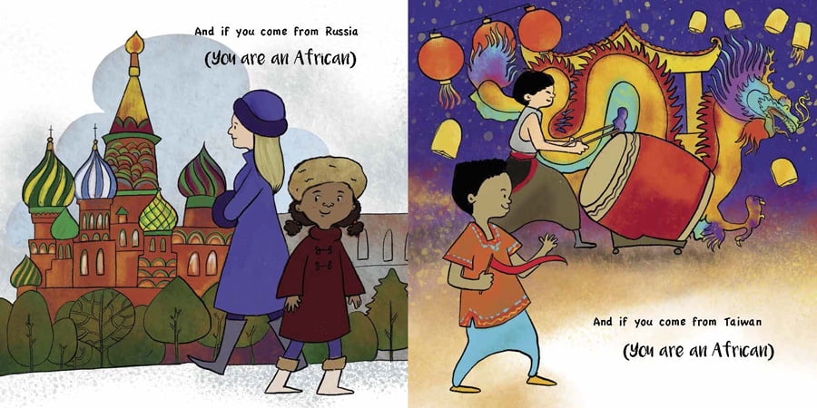 The first book of the series (working alphabetically at least) is African, adapted from the song by Peter Tosh. This was a song I had never heard before I read the book so I had no idea what to expect. Those familiar with the song will know that it is a call “to all black people that they are part of the same community” and this theme is reflected strongly through the artwork. The book shows black people taking part in communities all over the world from London to Miami, Moscow to Trinidad, and showing off what makes them unique.