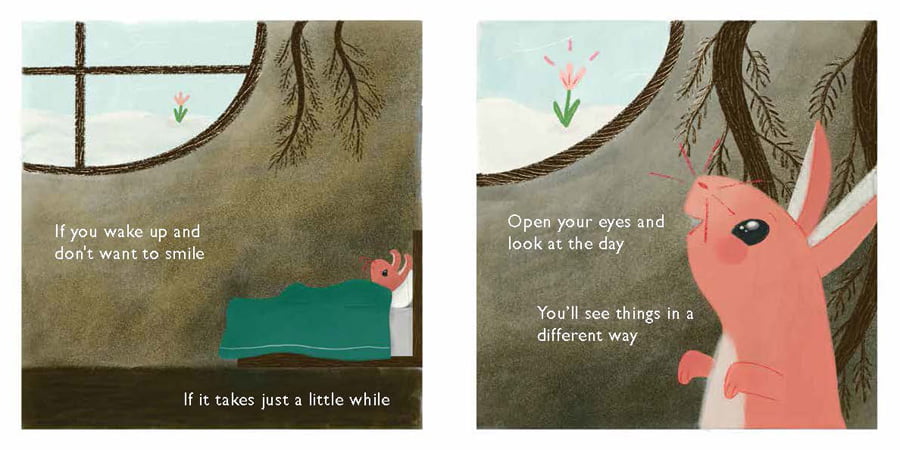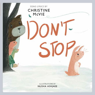 Next up was a book based on a song I know very well indeed, “Don’t Stop” by Fleetwood Mac has been a favorite of mine for many years. The style of the Don’t Stop book was wildly different from the previous one and the illustrations follow an adorable pink rabbit who has awoken on a snowy day in spring feeling sad and a little depressed. As the day goes by, the rabbit’s friends come out of their winter hibernation and help them to see the bright side of the day. Together they find the first flowers of the new season and have fun in the snow.