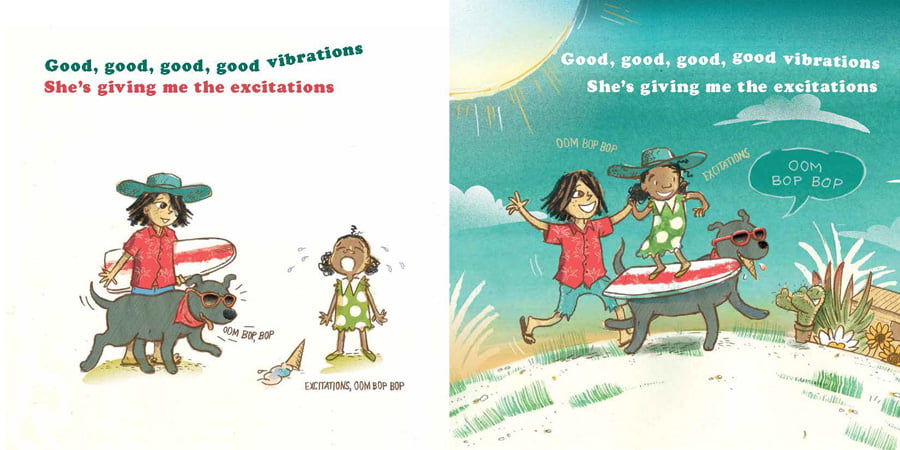The story the book tries to tell us is about a girl and her dog making their way to the beach with a surfboard in tow and leaving good-natured chaos behind them. It’s a cute, fun story with bright, summery illustrations by Paul Hoppe, but because that story has nothing to do with the lyrics at all, it just feels simply odd.