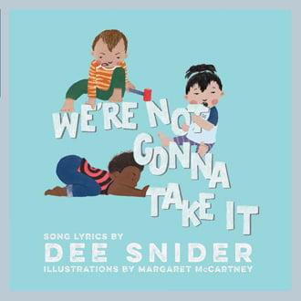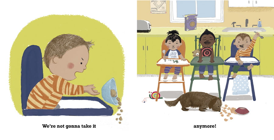The fourth and final book is this first wave of LyricPop titles is We’re Not Gonna Take It by Dee Snider of Twisted Sister. This anti-establishment anthem isn’t one I know well, and here the lyrics have been illustrated with a twist, rather than railing against the establishment, the kids here are fighting against their parents. The three toddlers in the book are not gonna take being fed healthy food when there are cookies nearby, nor are they happy about bathtime, or being forced to play in a playpen when there is a vast world out there to explore. No matter how much their parents try to control them, these kids are determined to fight against the authority figures in their lives!