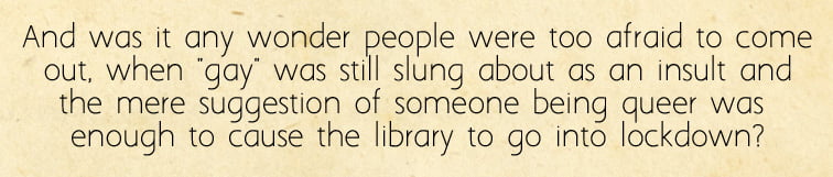 As for the characters, I did find myself getting occasionally mixed up given how many of them there were by the end. Once you add together the members of the Paper and Hearts Society, Read with Pride group, and occasional others like Olivia’s younger sister, there were nearly a dozen teens to keep track of and I often got mixed up about who was who – even when reading nearly all the book in one day. With so many characters to follow, it was natural that the majority were rather two-dimensional, with only Olivia having a huge amount of character development. Of her friends, Ed was the one who leaped out as having a distinct personality, even more so that Olivia’s girlfriend Cassie who received surprisingly little page-time. I’d have loved to see more development for the Read with Pride members and I felt like the book could have benefitted from that extra length.