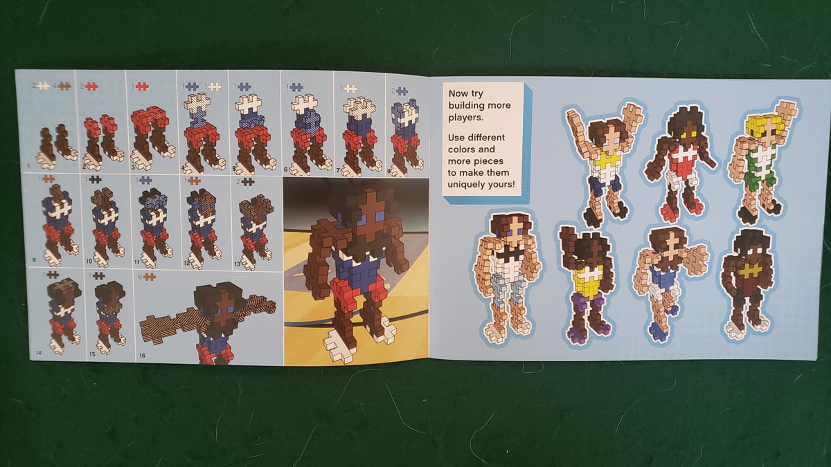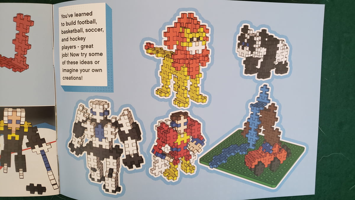 One thing we liked is the book had other suggestions. It showed how to build one soccer player but had a picture with an alternate design letting you know that by swapping out colors you could make different people including skin-tone variations. The book included designs for basketball, football, and hockey as well. What really impressed me is that the back to book showed a selection of animals or other ideas you could make with the same color pieces from this set, underlining that just because the project instructions are sport-related, that doesn’t mean that’s the only way to play.